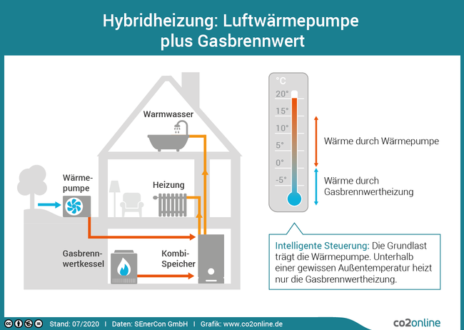 Eine Luftwärmepumpe, die gängigste und günstigste Variante, gewinnt Wärme direkt aus der Umgebungsluft. In den Übergangszeiten Frühling und Herbst versorgt sie den Haushalt verlässlich mit Wärme. Im Sommer trägt sie die Hauptlast und die Gasbrennwertheizung bleibt aus. Diese übernimmt erst, wenn es für die Luftwärmepumpe draußen zu kalt ist, um effizient zu arbeiten. Gleiches gilt für eine Hybridheizung mit der Kombination Ölbrennwertheizung und Wärmepumpe.